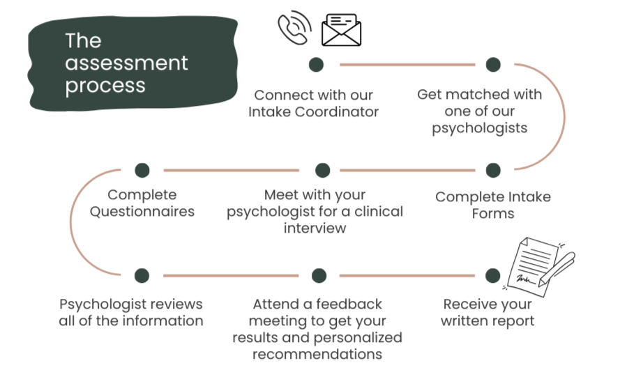 Our psychologist's hourly rates are $250 per hour; assessments can therefore range from $1,750 to $2,500 in total. You are billed for the assessment in installments after each portion is completed.